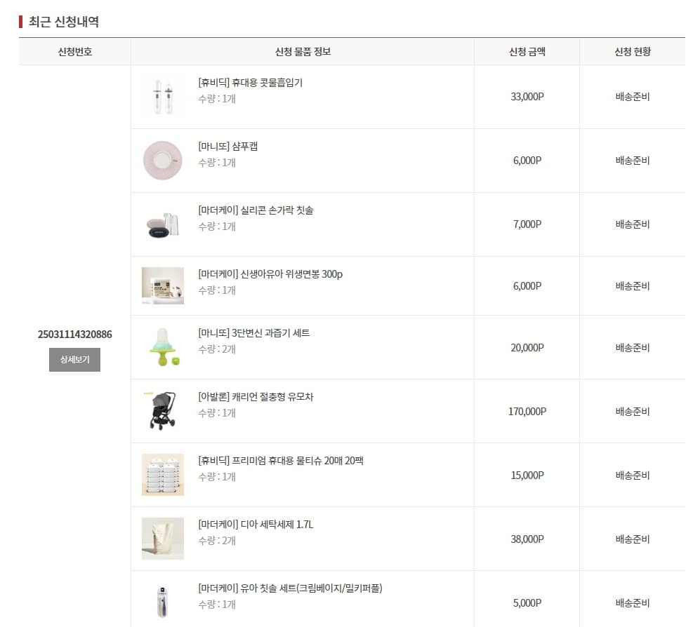 다양한 출산/육아 관련 용품을 지급받은 포인트 내에서 원하는 대로 구성하여 신청가능합니다.