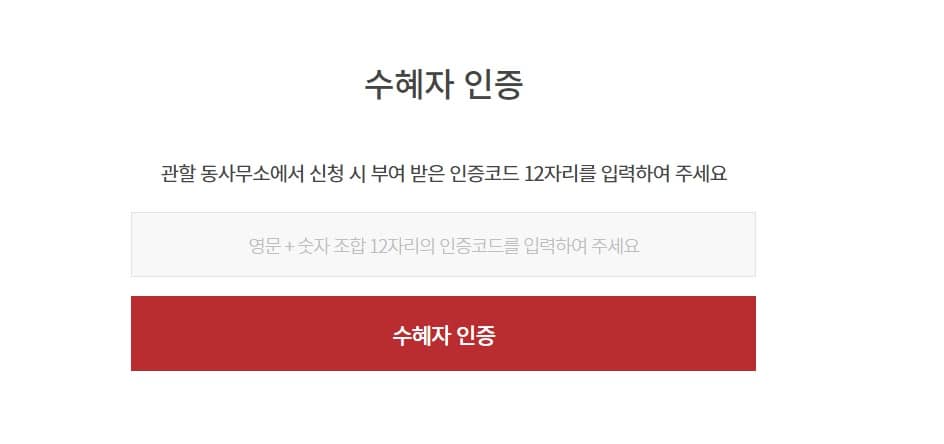 회원가입을 하면서 관할 행정복지센터에 신청 시 부여받은 인증코드를 입력합니다.